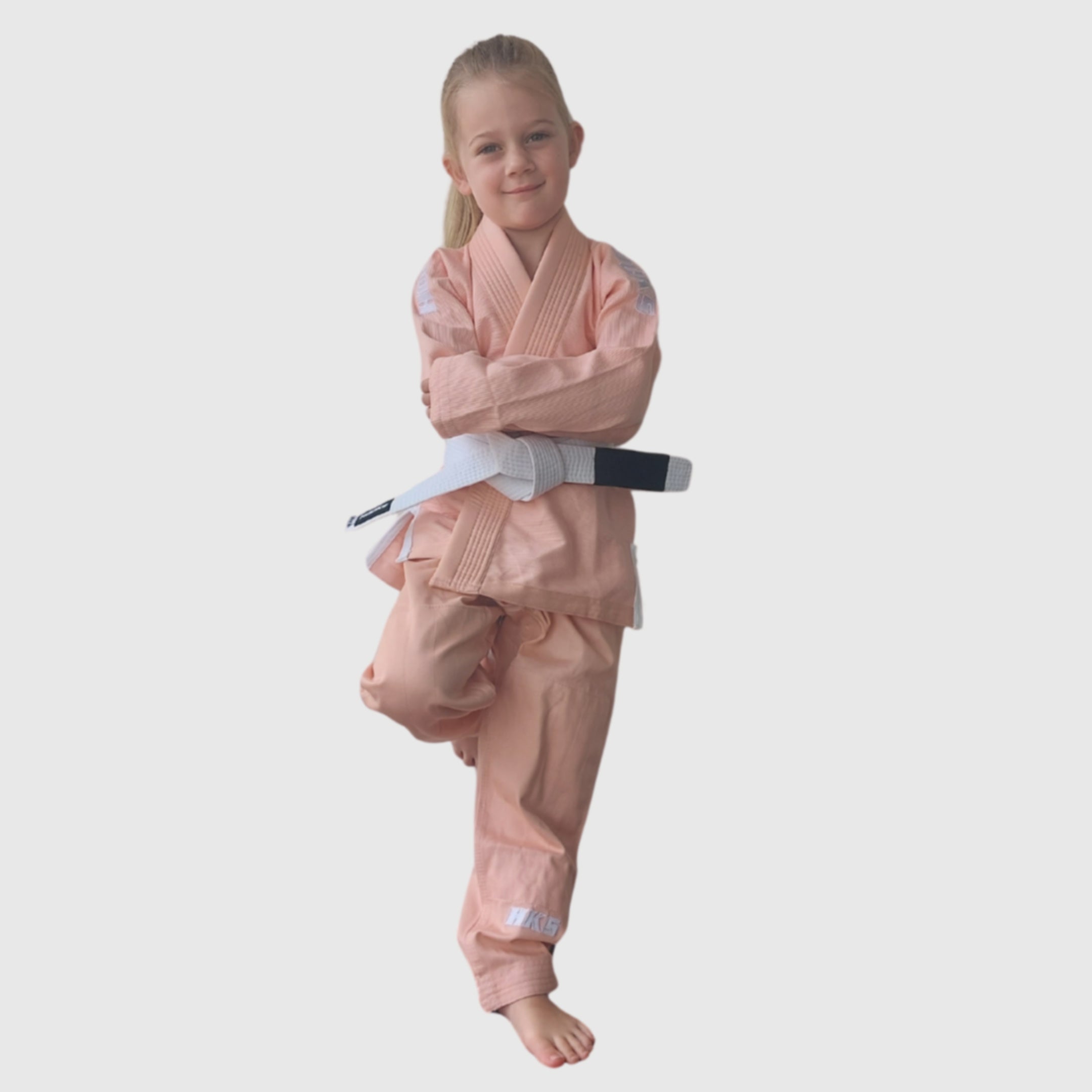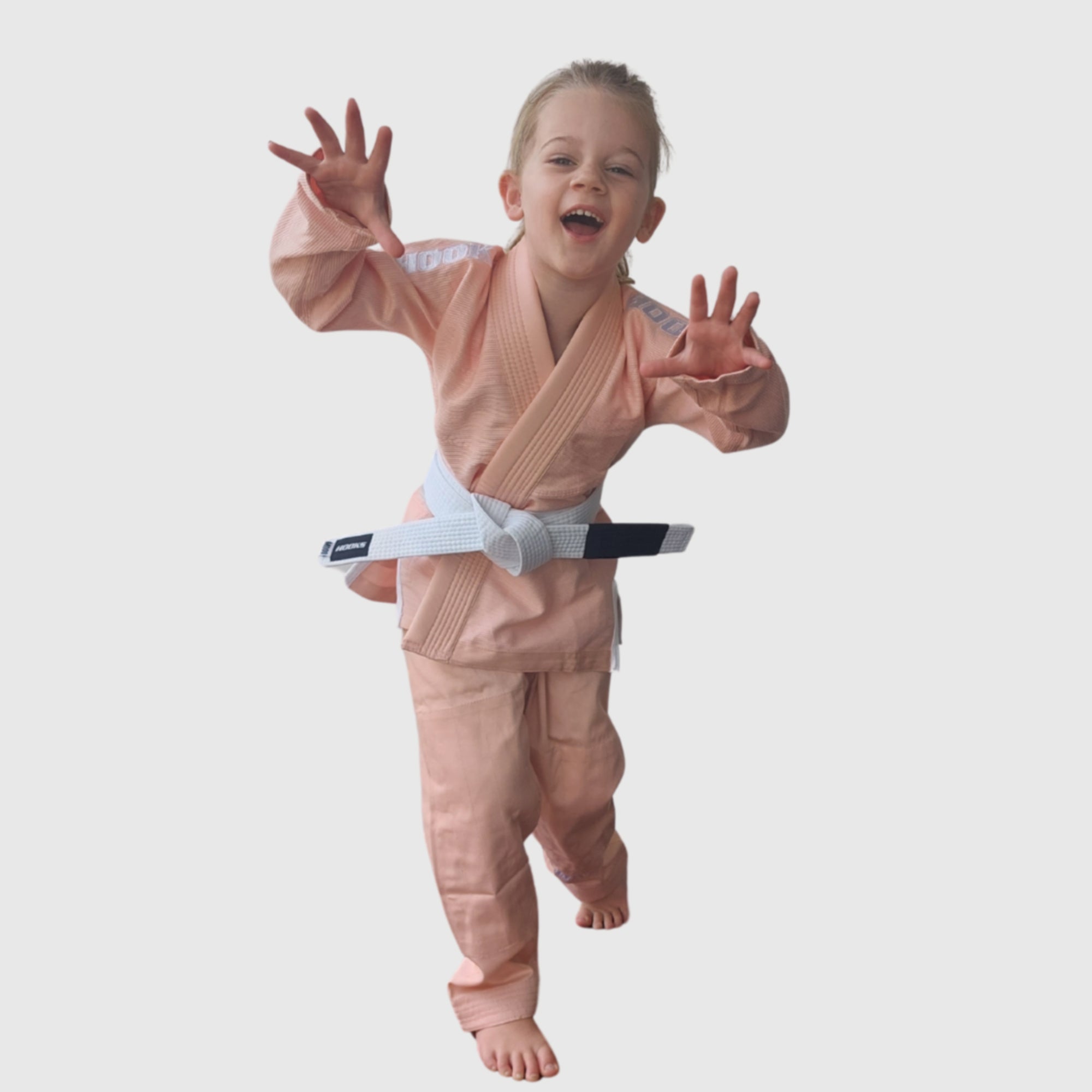 Peachy, punchy, and ready to roll. Light, comfy, and made for little grapplers with big energy.